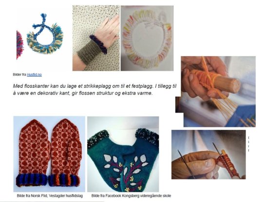 Til strikket floss: Ta med pinner nr 2 ½ , 3 eller 3 ½ etter ønske og gjerne ditt eget passende garn. Hvis du vil strikke flosskant til votter eller pulsvanter, ta med 5-pinne-sett.